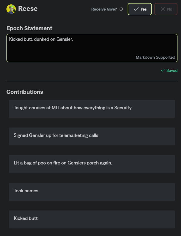 Each Epoch will prompt users to enter their Epoch Statement, which should function as a summary of all the contributions that user made during the active epoch.&#x20;