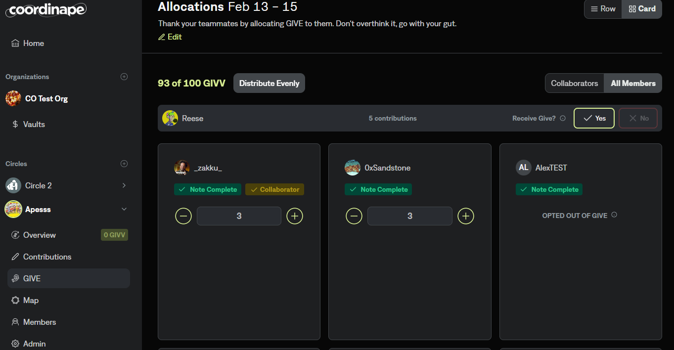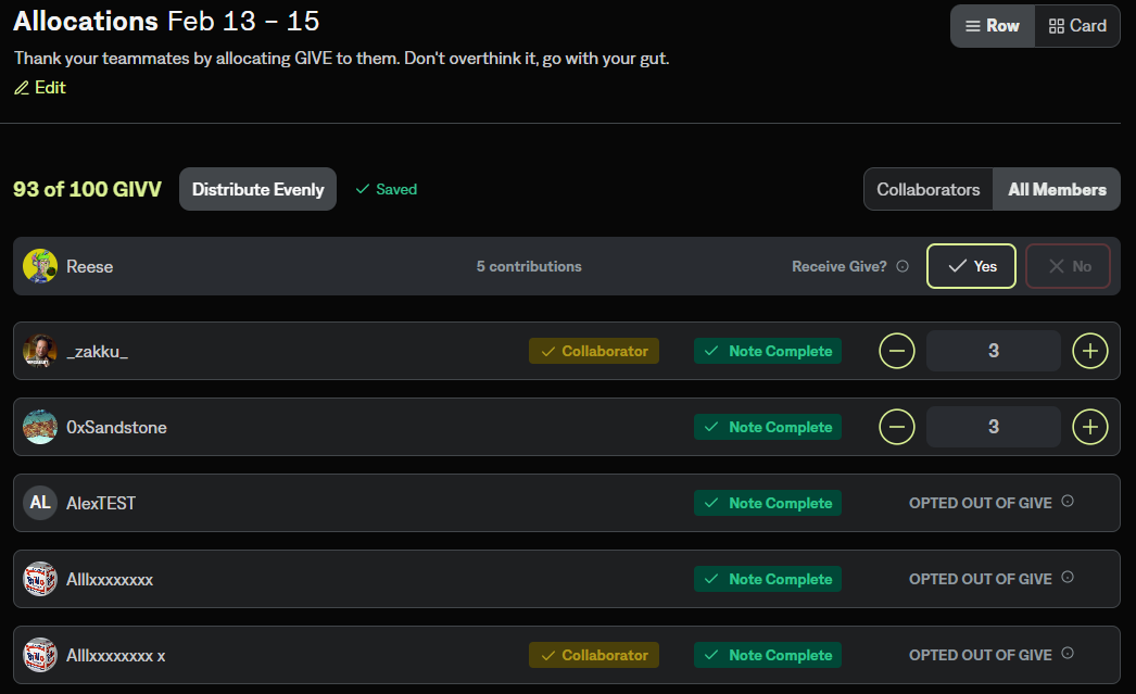 The Allocation Page allows you to appreciate the teammates you have selected by sending them GIVE and Notes. You can browse member Epoch Statements, and Contributions to help determine how much Give to allocate across your team.